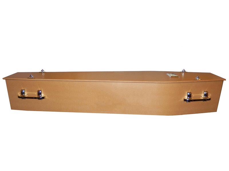 - Composite board basic coffin with four brown plastic handles and cotton interior
